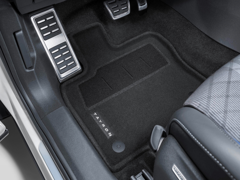 Personalizzati con la scritta "Tayron", coniugano le caratteristiche di funzionalità dei tappeti in gomma all’eleganza di quelli in moquette. Provvisti di un bordo ad "U" che trattiene lo sporco e l’umidità, proteggono in modo sicuro il fondo della vettura. Il sistema di fissaggio integrato impedisce ogni spostamento. Il kit comprende 2 tappeti anteriori e 2 posteriori.